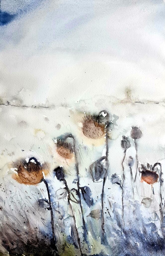 A dance of colors and flowing lines… with fluid brushstrokes and washes that evoke the shapes of stems and natural forms. With this artwork, I wanted to highlight the transparency and beauty of the watercolor medium.